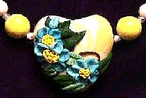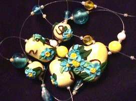When those are all applied, put your little "center" ball in the middle of the petals and flatten it slightly. Use the pointed end of the toothpick to texture the center *and* make a better contact between the raw and baked clay, by poking the center ball repeatedly. You can elongate one petal and roll it into a "bud" shape, too, if you want to. Now, do some more vines and leaves and flowers wherever you want them on the bead. You can lay the vines out in precise "equators" and use a regular pattern, or you can be random in your placement. When it's done, stick it in the scrap clay and go on to the next bead. When you're done with the last one, it's a good idea to let them sit long enough for that last bead to absorb the extra diluent... ten or twenty minutes, maybe? I really do like using that stuff, cause I really do like my parts staying put. :-) After curing, I had a really nice glow from the buffing on the bead itself, and a matte look to the flowers, which I liked, so I didn't glaze them. (This is pretty amazing, 'cause I normally Flecto *everything* that sits still!) I'm rarely happy with my work, but, I really do like how these turned out. Hope you enjoyed this little lesson, and that it makes you want to go play with clay.... If you make some of these, I would love to know where you have them posted. Email me to give me the URL. I'd like to post them, here, too. |