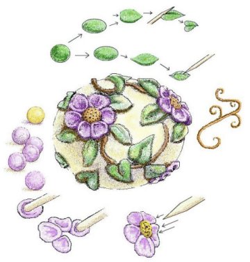 Now, your colors. You'lll need five or six leeeetle teeeeny balls of flower color for each flower, one ball of yellow, and about seven to nine leaves for every flower. About halfway though this prep, you'll need to put that second coat of diluent onto the baked bead base. For the petals and centers, leave the clay in ball shapes. For the leaves, make two different kinds, both go from a "ball" to a "football" shape, but one, you exaggerate the pointy ends and the other, you flatten one end and make the other pointy. Both types of leaves you detail with the pointed end of your toothpick... they look fine with just one crease down the middle, or you can add side veins after you put them on the bead, if you like. Roll tiny little threads for "vines," half an inch or an inch long. You'll need two or three for a bead that's in the 1/2" size. Okay, all that's ready... pick up a skewered toothpick and brush one more time with diluent... the brush should be nearly dry, but there'll be enough diluent on it to help stick new clay to baked. It's softening the outer layer of cured clay. I use diluent between any two pieces I am trying to attach, baked or not. I read that on a newsgroup posting, once, and since I started doing that, I've noticed a big difference... my parts don't fall off, any more! :-) Okay, now with the pointy end of your toothpick, pick up one of the vines, and drape it on the bead... push it around a bit with the toothpick until it looks pretty. Decide where the first flower is going to go, and use the toothpick as a tiny brayer to roll the clay firmly onto the bead at that spot. Use the minimum pressure that will make the clay stick on the other parts of the vine. If the vine slips and slides all over, set the bead aside for a bit, until the excess diluent is absorbed, or remove the vine, wipe the bead off and start over. Certain browns will "bleed" if there is too much diluent on the surface. At the place you decided the first bead would go, apply some leaves to the vine, leaving room in the midst of them for the flower. The leaves can face in all directions... I try not to let them look alike... some can tilt up at the ends, some can curl under. In the "clearing" you've left for the flower, leave a space in the middle to put in the flower center, last and off to one side of that, (see bottom of illustration, above) apply the diluent in a small spot with a nearly dry brush, and put down one "petal" ball. | Smoosh it a little, but not all the way flat.
