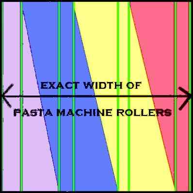 Can you see how, after you fold this sheet on the line that runs across the center, the clay between the green lines will have it's own "zone" that the adjacent colors won't encroach upon? You can make these areas of "pure" color wider by making the diagonals steeper, and you can eliminate the "pure" colors that you start with by making the diagonal cuts shallower. |